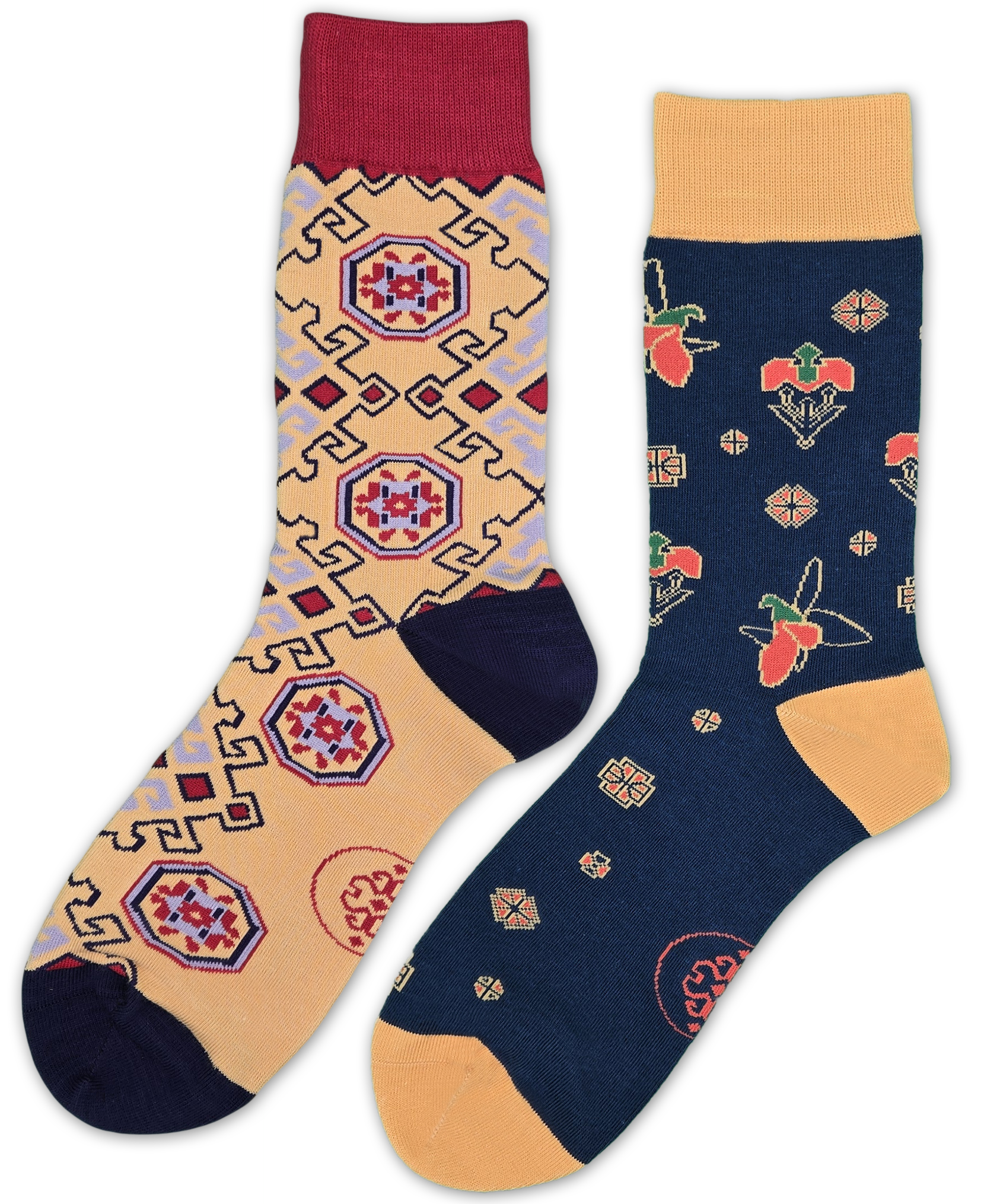 This combination embodies the restraint and sophistication of an evening look. If you prefer subtle colours highlighted by gentle flashes of red in intricate patterns, Karabakh socks is your perfect choice for tonight. But if you wish to add a touch of contrast, the Nar design - with its golden base enriched by deep blue, violet, and red accents inspired by Eastern motifs - makes a striking statement.