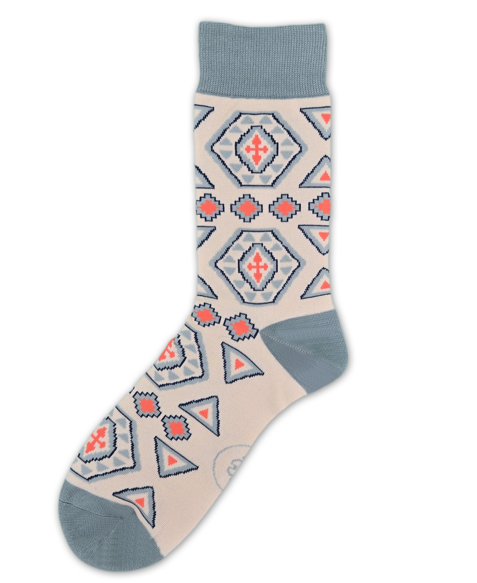 Inspired by the poetic Kilim Flower symbol, these socks celebrate beauty, new beginnings, and life’s cyclical nature. The Kilim Flower motif weaves elegance into the fabric, while the diamond-shaped motifs and rich colours also resemble Pakhlava — a beloved Eastern dessert where layers of flavour and texture unite in perfect balance. Together, these motifs tell a story of peace, diversity, and empathy, where tradition and taste, art and life, are seamlessly interwoven.